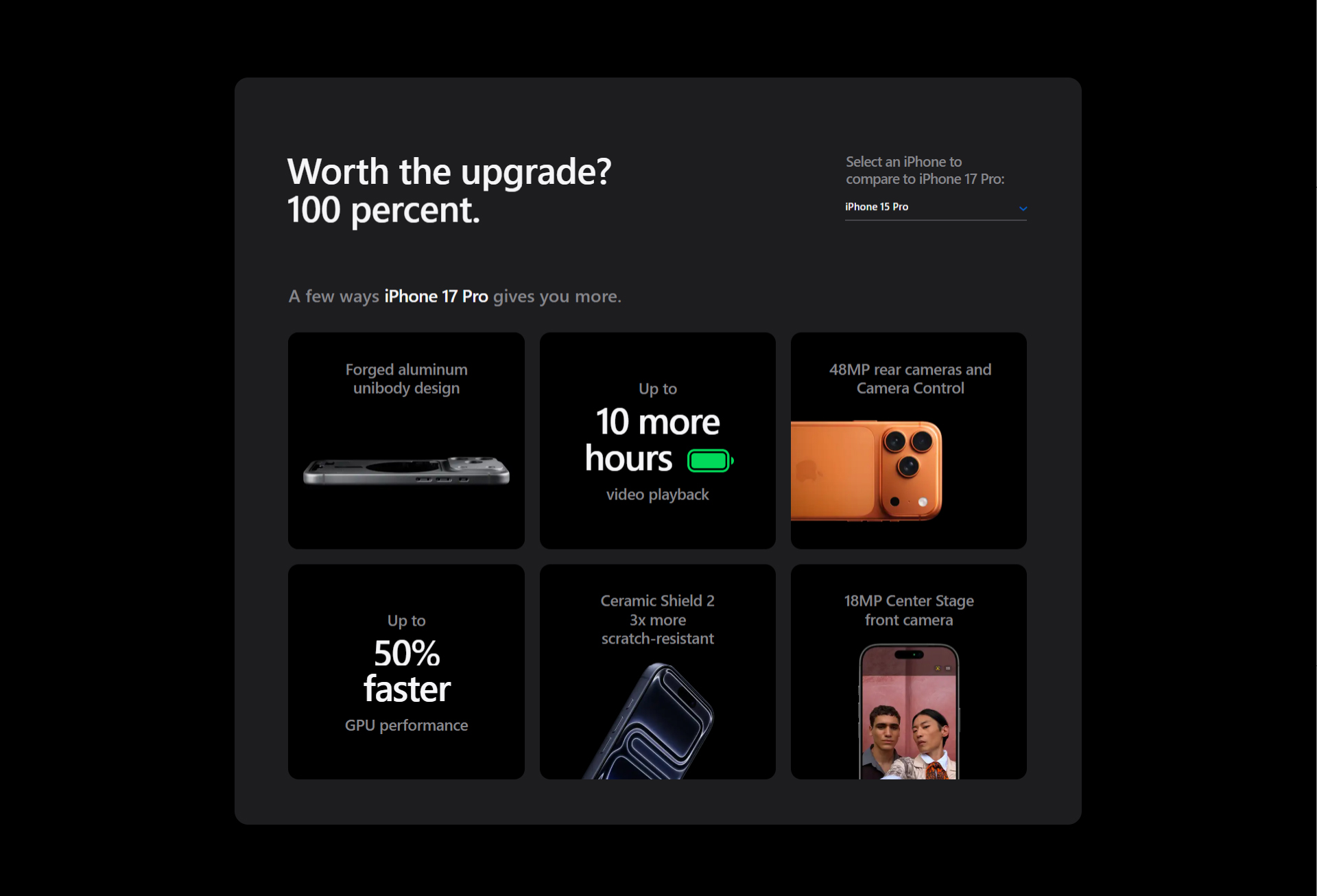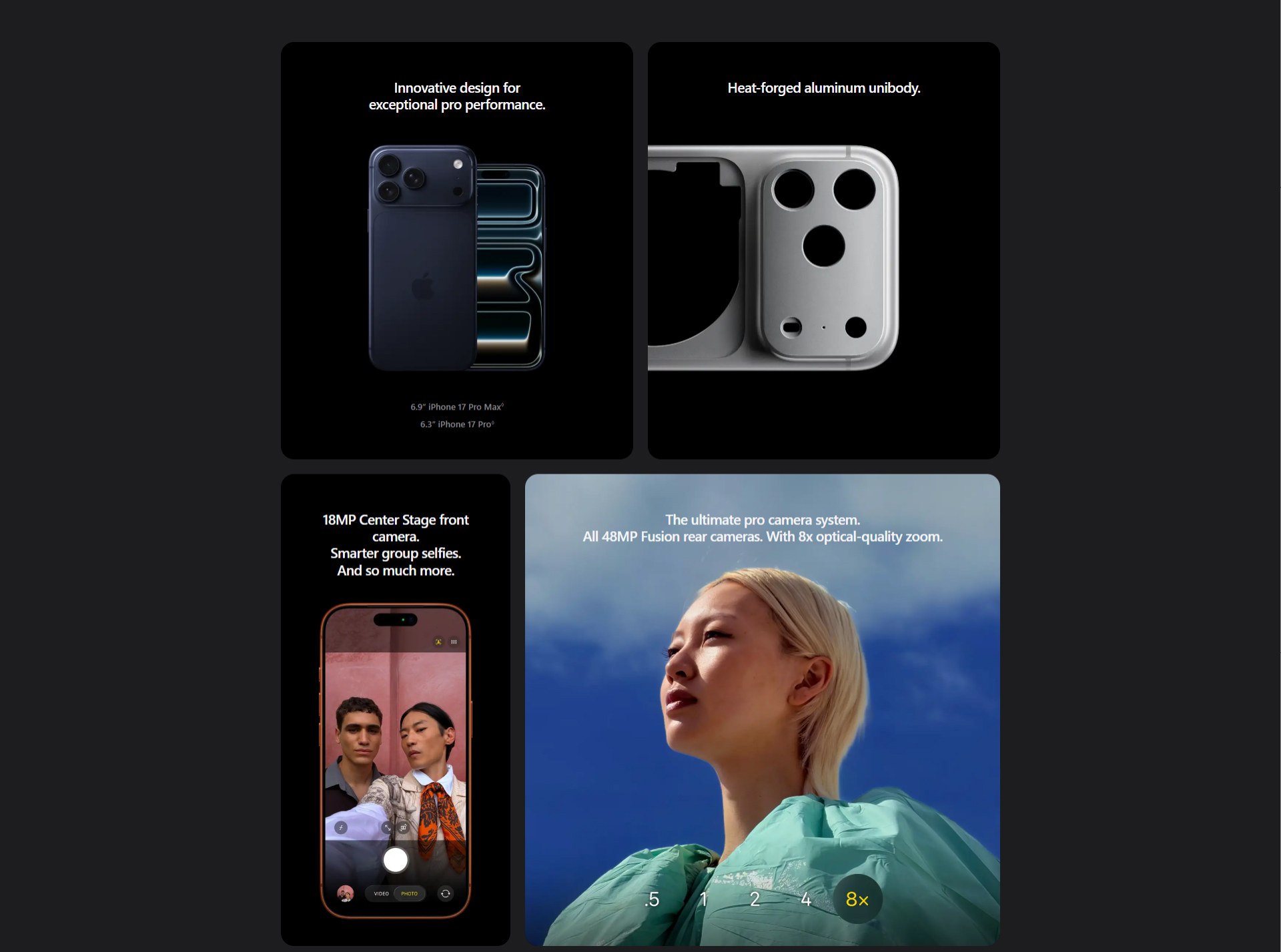 Front Camera : 18MP Center Stage front camera Rear Camera : 48MP Main Camera, 48MP Ultra Wide Camera, 48MP Telephoto Camera |